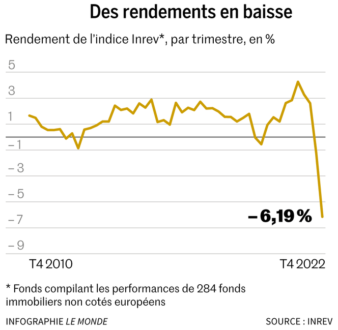 “El sector inmobiliario europeo no cotizado registró una rentabilidad total de −6,19 % en el cuarto trimestre, indica esta asociación de inversores. La corrección fue brutal y sincronizada entre los mercados, aunque los niveles de caída variaron de una zona geográfica a otra. » En el tercer trimestre ya se había observado una caída del 1,60%.
