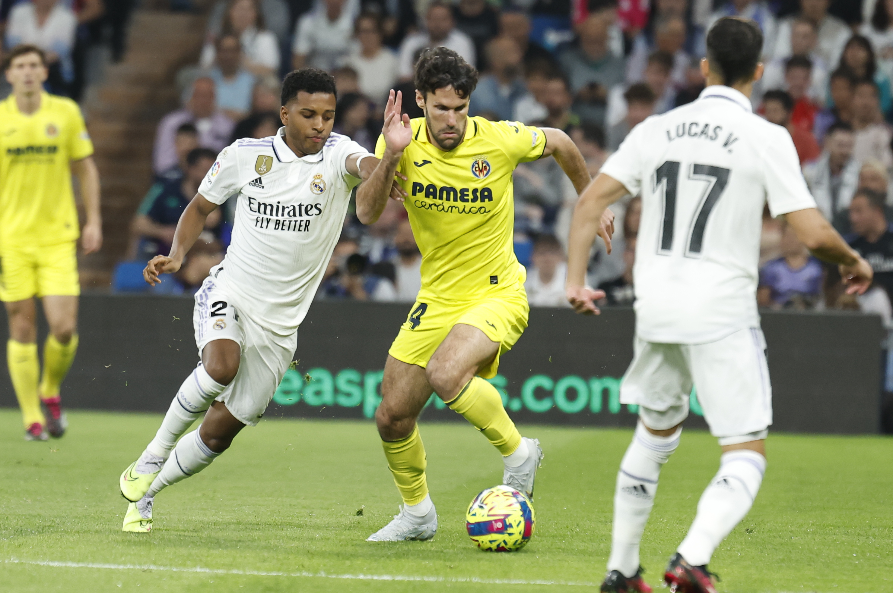 El Villarreal se ha rehecho después del segundo gol y vuelve a buscar el empate. Mandi consiguió construir a Courtois con un remate de cabeza pero el gol se anuló por fuera de juego. El conjunto amarillo está llegando al área del Real Madrid, pero le falla la puntería. El conjunto blanco tampoco se ha dormido en los laureles y busca ampliar la ventaja y sentenciar el partido.